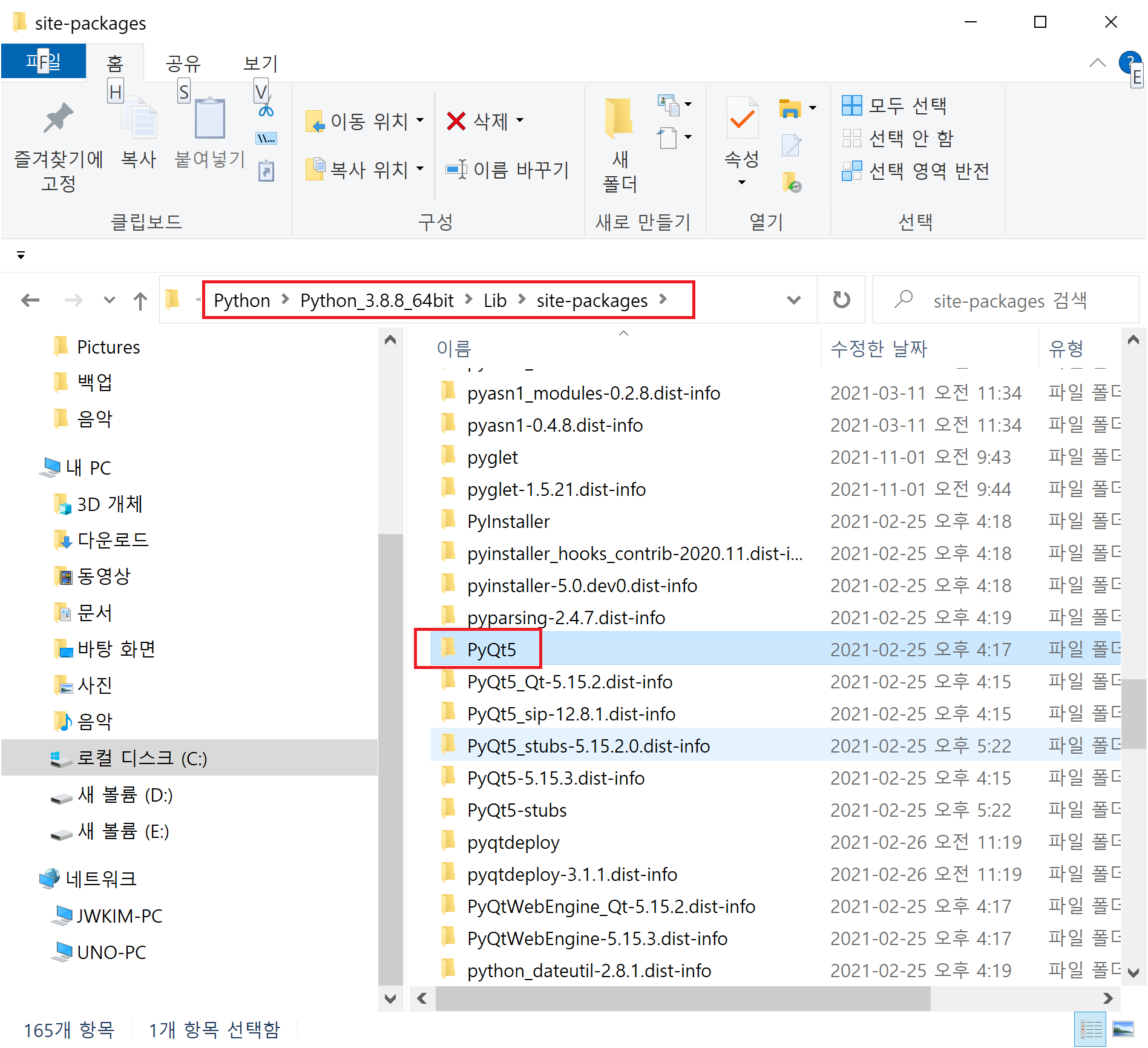 파이썬의 모든 외부 패키지는 이 경로에 설치되므로, PyQt5라는 패키지 폴더가 존재하는지 확인하고 있다면 잘 설치된 것입니다.